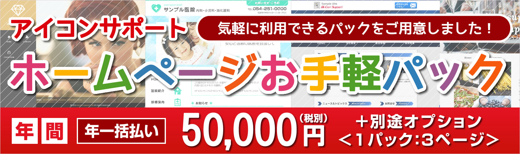 ※オプションをつける場合は別途かかります。 通常プランとご一緒に、様々なオプションもご用意しております。お客様のお好みに応じたオリジナリティ溢れるホームページ作成も可能です。ぜひご利用ください。 |